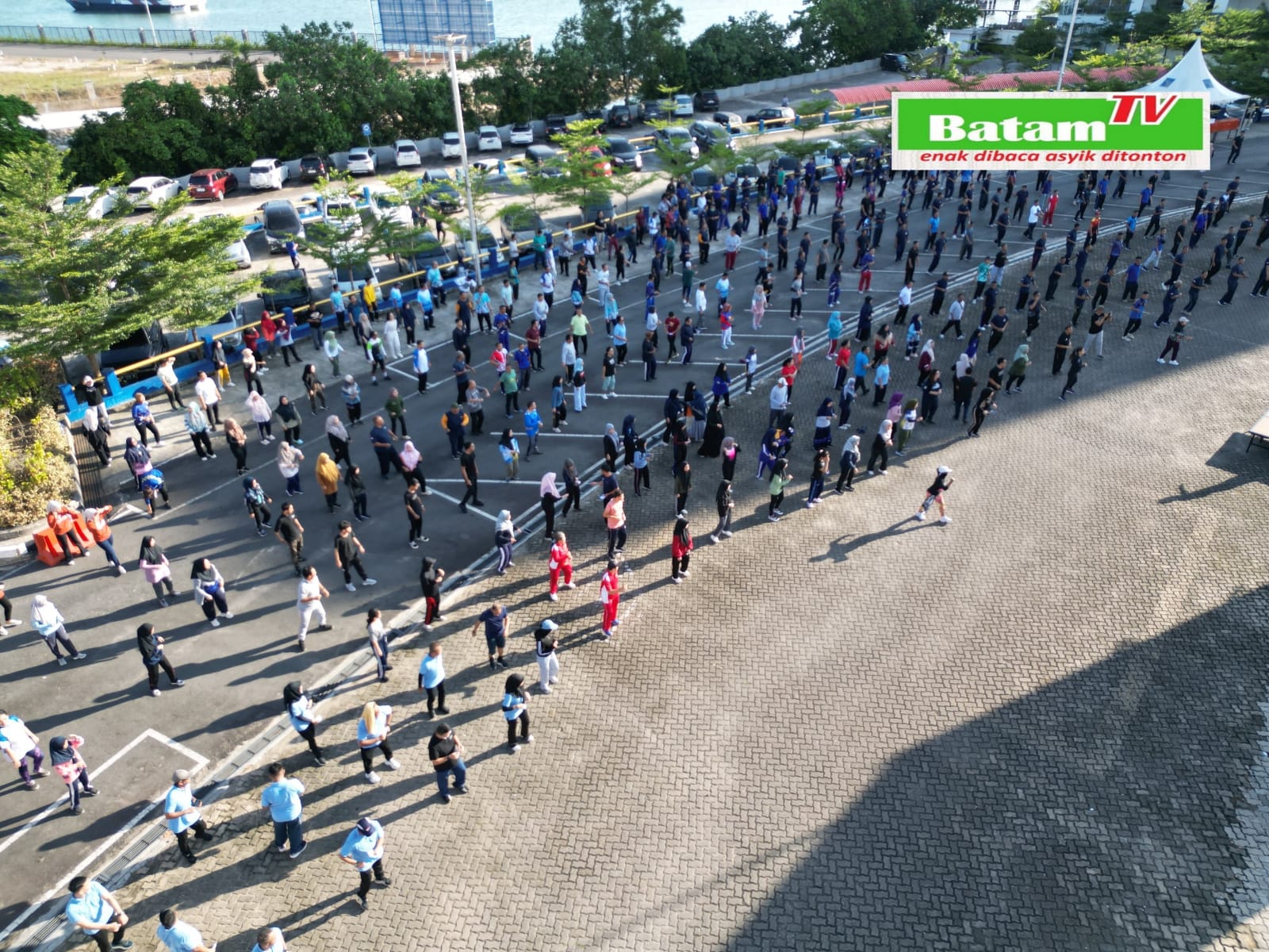 Gelar Senam Gabungan Akhir Tahun, Karyawan BP Batam Sehat dan Produktif. Tampak dari ketinggian suasana senam gabungan karyawan BP Batam di lapangan parkir BP Batam, pada Jum’at pagi (6/12/2024).  (foto : Azura Aronita-batamtv.com)