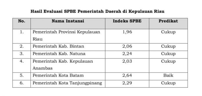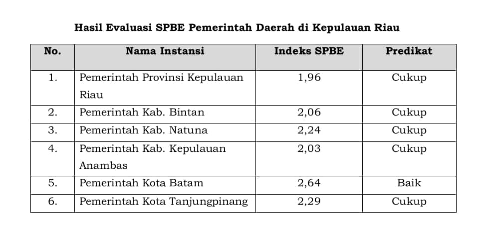 BATAM, batamtv.com – Kota Batam satu-satunya daerah di Kepri yang mendapatkan predikat baik dalam Hasil Evaluasi Sistem Pemerintahan Berbasis Elektronik (SPBE).