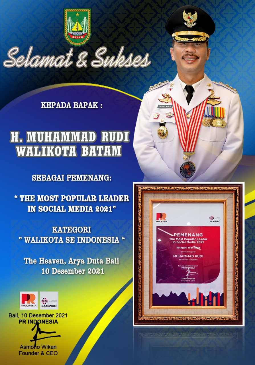 BATAM, batamtv.com – Wali Kota Batam Muhammad Rudi kembali mendapat penghargaan, kali ini dari Majalah PR Indonesia. Rudi dinobatkan sebagai Most Popular Leader in Social Media Sub Kategori Wali Kota. Penghargaan ini diberikan pada Forum Jambore PR INDONESIA (JAMPIRO)di Provinsi Bali, Jumat (10/12).