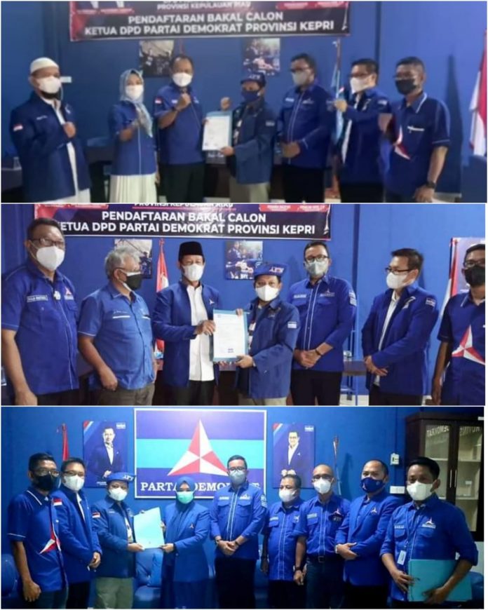 BATAM, batamtv.com – 3 orang calon Ketua DPD Partai Demokrat Kepri sudah mendaftar bersama pendukungnya yaitu pengurus dpc partai kota/kabupaten se-Kepri, Sabtu 28 Agustus kemarin. Secara resmi sesuai aturan partai, calon ketua DPD propinsi kepri bersama ketua DPC pendukungnya wajib menghadiri pendaftaran dan menyerahkan berkas dukungan. “Sesuai aturan administrasi partai secara resmi ke3 calon, hadir bersama ketua dpc pendukungnya” kata Wasekjen DPP Partai Demokrat Renanda Bahtar Sabtu kemarin.