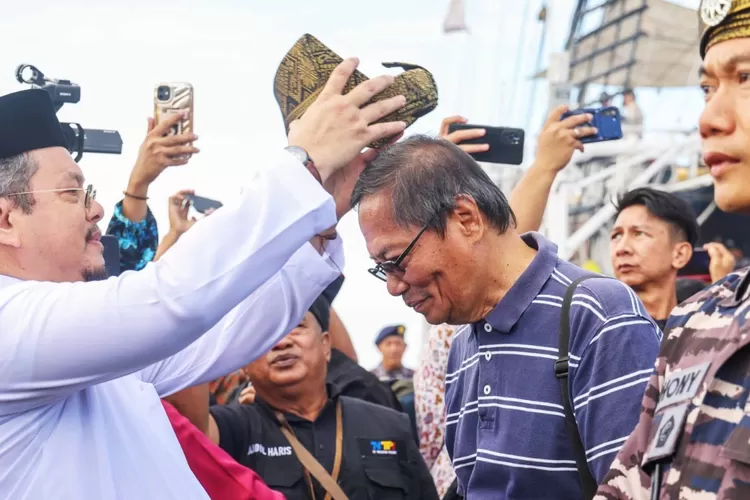 Staf Ahli Bidang Pemerintahan dan Hukum Setda Kepri, Sardison menyematkan tanjak ke Komandan KRI Dewaruci Letkol Laut (P) Rhony Lutvia bersama dengan seluruh anggota Laskar Rempah,Jumat (5/7/2024).