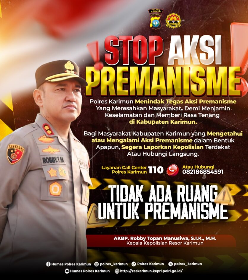 Karimun,batamtv.com, – Kapolres Karimun AKBP Robby Topan Manusiwa. S.I.K., M.H. menegaskan bahwa pihaknya menolak segala bentuk premanisme, terutama yang berkedok organisasi masyarakat (ormas).