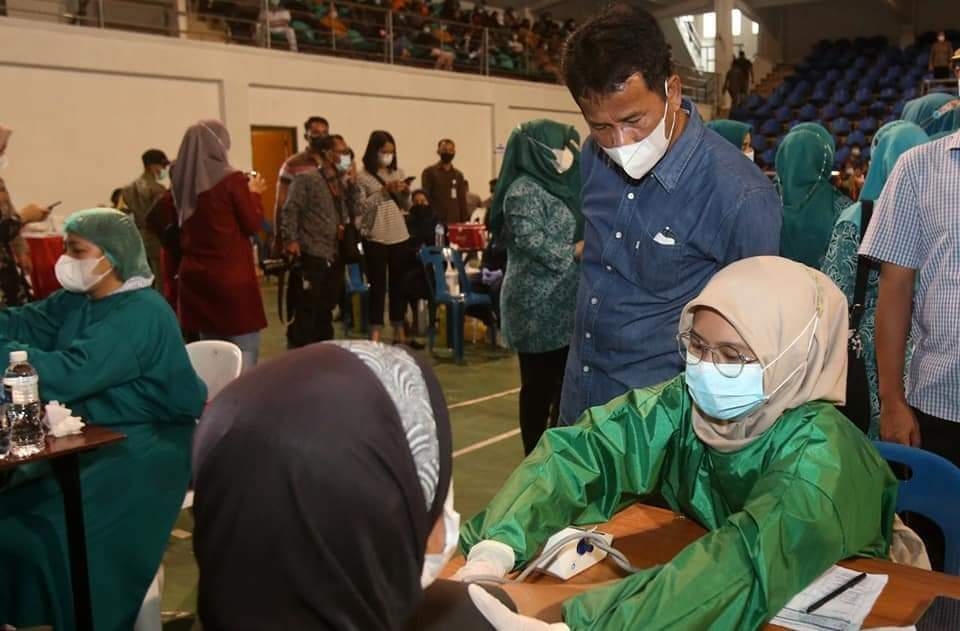 Walikota Batam, Ham Rudi (kemeja biru) saat menyaksikan vakainasi booster di Batam. (F: Aby- batamtv.com)