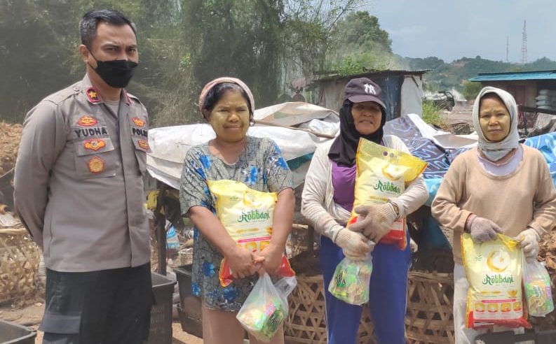 Kapolsek Sekupang Kompol Yudha Suryawardana juga langsung menyerahkan bantuan paket sembako berupa beras dan mie instan kepada ibu-ibu pekerja pembuatan arang tempurung kelapa.