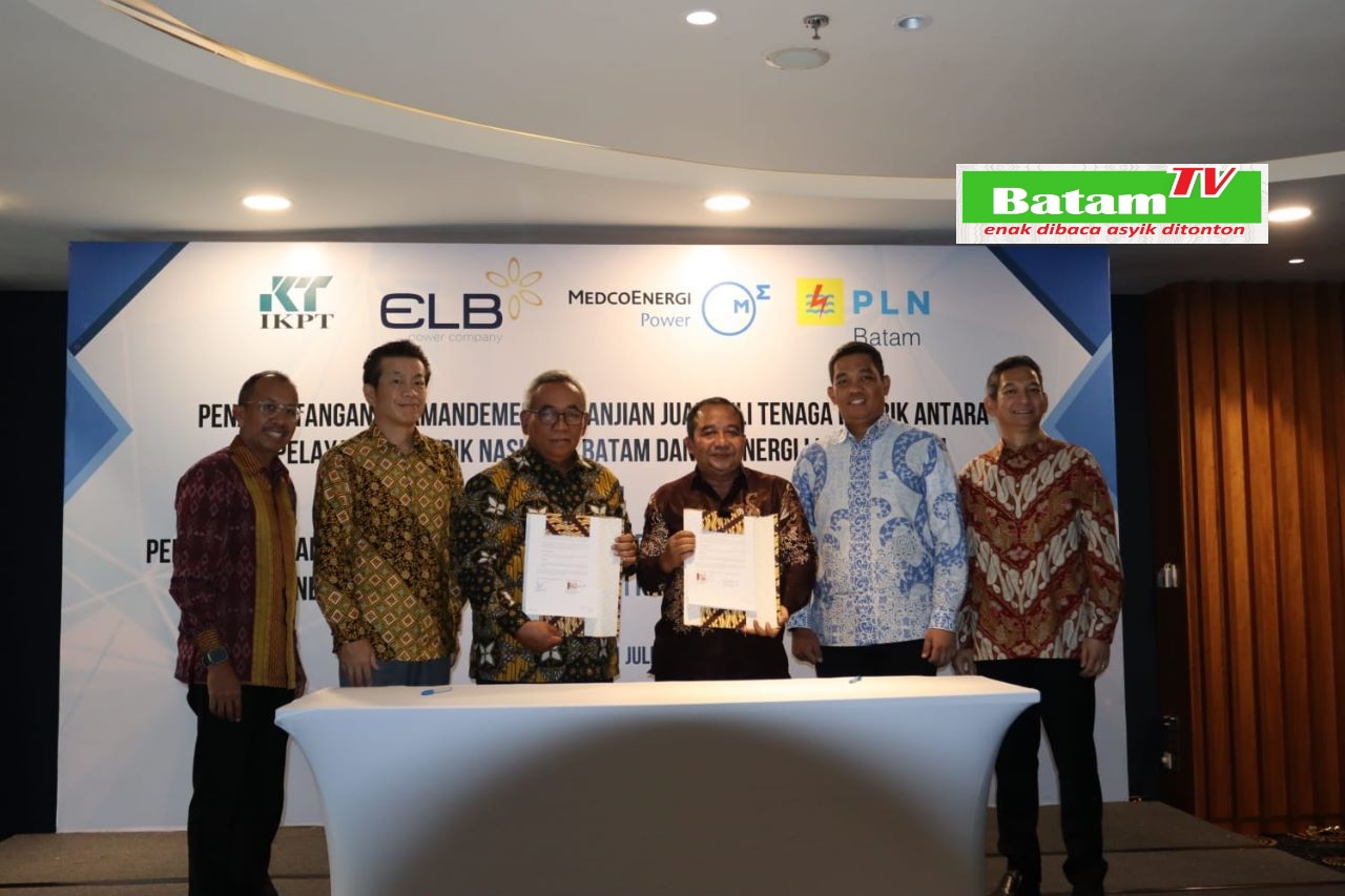 Kolaborasi PT PLN Batam dan PT ELB untuk meningkatkan kapasitas Pembangkit Listrik Tenaga Gas Uap (PLTGU) Tanjung Uncang, diharapkan makin memperkuat kelistrikan Batam dan menghasilkan efisiensi bagi kedua perusahaan. Tampak berpose bersama dari kiri ke kanan: Direktur Utama PT Medco Power Indonesia Eka Satria, Director PT Kansai Electric Power Indonesia Takeshi Shimada, Direktur Utama PT Energi Listrik Batam Bambang Urip Setiawan Adi, Direktur Utama PT PLN Batam Muhammad Irwansyah Putra, EVP Divisi Pengendalian Pembangkit dan IPP PT PLN (Persero) Emir Muhaimin dan Komisaris Utama PT Medco Power Indonesia Amri Siahaan., di gedung PLN Batam Centre Jum'at (21/07). (foto : muhammad amin-batamtv.com)
