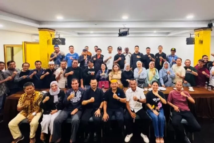 Warga Sulawesi Selatan yang tergabung dalam PKSS berfoto bersama dengan Ketua Terpilih Ahmad Rosano (tiga dari kanan) usai deklarasi di Hotel King Seraya, Jumat (7/6/2024) malam.(Foto : Muhammad Amin/batamtv.com)